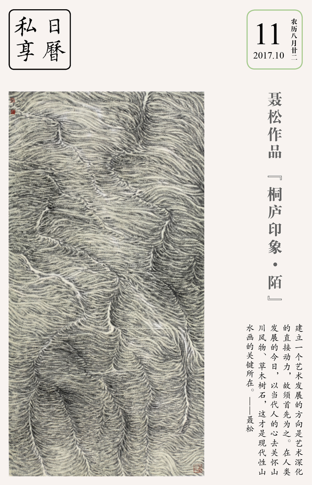 建立一个艺术发展的方向是艺术深化的直接动力,故须首先为之。在人类发展的今日,以当代人的心去关怀山川风物、草木树石,这才是现代性山水画的关键所在。——聂松