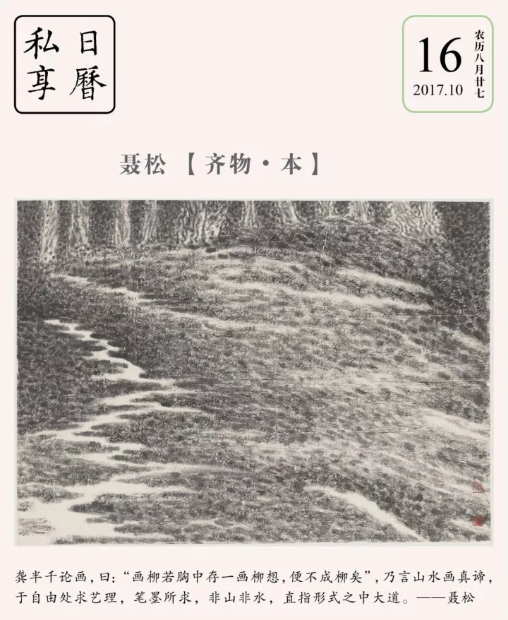 龚半千论画,曰:“画柳若胸中存一画柳想,便不成柳矣”,乃言山水画真谛,于自由处求艺理,笔墨所求,非山非水,直指形式之中大道。——聂松
