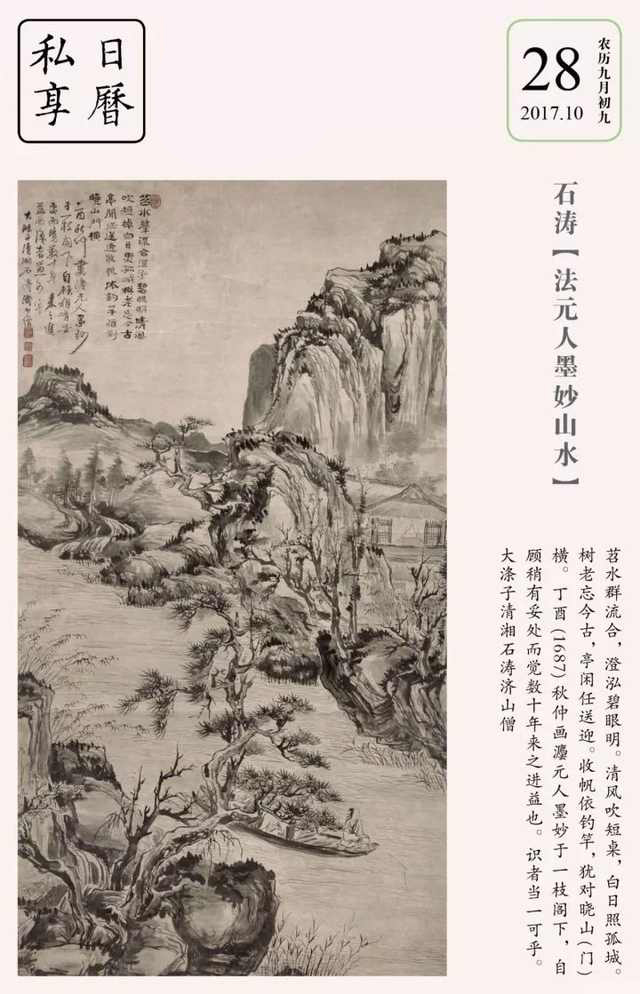 释文:苕水群流合,澄泓碧眼明。清风吹短桌,白日照孤城。树老忘今古,亭闲任送迎。收帆依钓竿,犹对晓山(门)横。丁酉(1687)秋仲画灋元人墨妙于一枝阁下,自顾稍有妥处而觉数十年来之进益也。识者当一可乎。大涤子清湘石涛济山僧