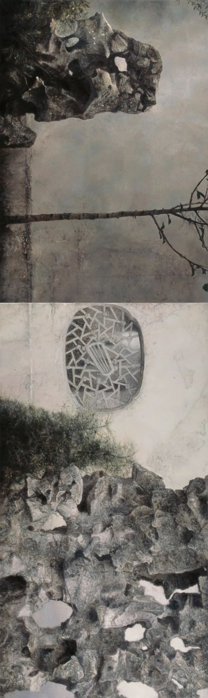 事實上,肖芳凱對於“荒敗”之園林的描寫,從某種層面上隱含了畫家本人的歷史態度和當下認識。肖芳凱很尊重歷史傳統,在很多的場合畫家總是用一種敬畏之心去面對或講述文化歷史。然而,肖芳凱對歷史傳統的敬畏之心並非是亦步亦趋的守舊保存,正如他將“園林”視為“廢墟”一樣,歷史傳統和當下文化之間的隔膜斷裂已然成為現實。肖芳凱意圖通過“荒敗”化的處理,建立起在歷史與現實之間的某種自我言說,討論的正是當代文化的當下認識與價值意義。如果我們能夠更關注肖芳凱創作的話,實際上畫家所刻意營造的“荒敗”景致,就是身處當代的我們每個人的內心——被假說的歷史、碎片的現實、商業的浸染、淡薄的人情、貧瘠的文化所結構出的奇異體——雖則看似或龐大或精巧,實質上如此得脆弱不堪。