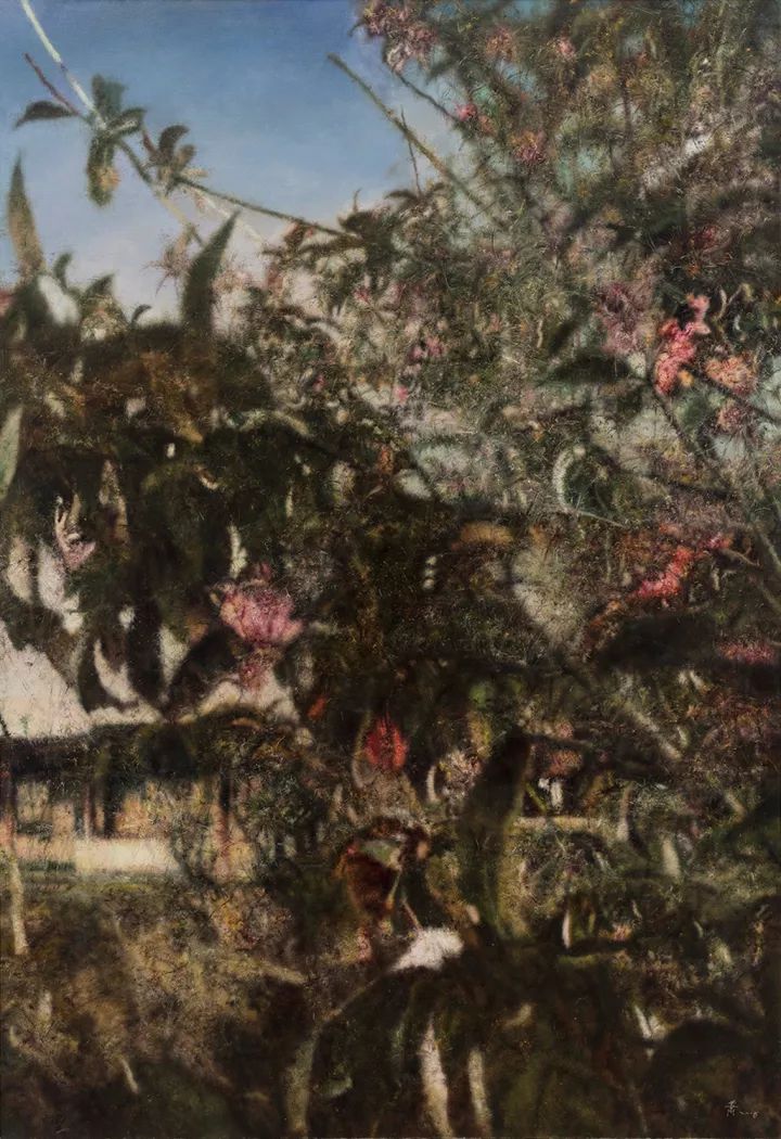 肖芳凱提出的“筆法即思想,呈現即觀念”,無疑是針對於自我創作的具體落實的,但是我相信它也會在未來對於創作整體產生影響。肖芳凱即便熱衷理論性的思考,但是畫家的責任更在於將所有的思想觀念逐步落實為具體的創作。肖芳凱逐步放棄了關於園林的整體性表述,而是隨手拈來般的自由擷取,以有目的地去解構園林的舊有相貌,而達成全新的視覺感受。光影投射也不再是造境的需要或者細節描畫的強調,現在它的好處顯然易見,因為光影已經轉化為肖芳凱控制畫面層次或者情緒空間的有機方式,並且可以穿插畫面其中讓各個層次交流互動,從而形成了生動的畫面整體。筆法,是肖芳凱此刻的核心話題,它的重要性在於畫家已將“筆法”從創作手法提升為創作方式。肖芳凱很強調書寫性的“筆法”,他往往從畫面的一個角落入筆逐漸蔓延至畫面的全部,痛快淋漓地一气呵成而刻意不做任何的預先約定。顯然,“筆法”在肖芳凱眼中不是純然的技術手段,而是創作力的核心內容,也就是說關乎“筆法”的“書寫性”,也不再是“筆法”的書寫特性,而是畫家情緒、精神、生命的流動痕跡,是視覺表達和精神抒發的不谋而合。