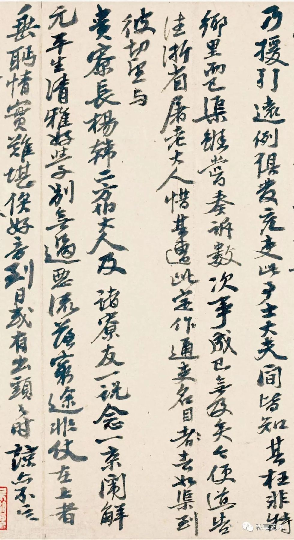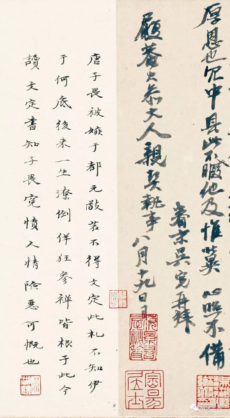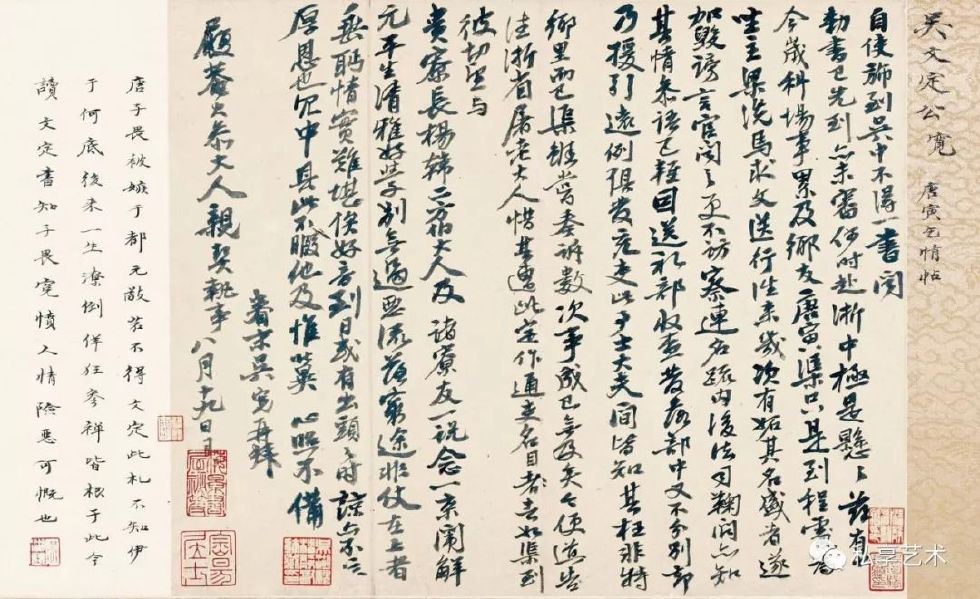 吴宽是唐寅的同乡,其时在京为官,得知后写信给浙江的同僚,请求他照顾即将到来的唐寅。信中吴宽言辞恳切,一再为唐寅申辩冤屈,流露出对其无限的同情与惋惜。 这通信札既能看出吴宽对后辈的关怀与爱护,也反映出了苏州文人提携后辈、爱才惜才的风气,这也是吴门得以聚集人才,形成一个影响广大的艺术流派的原因之一。 吴宽书学苏轼,意态宽和,颇有法度。从书法上看,整通信札字距绵密,字迹紧凑,点划微腴而提按自然,墨色由浓而淡,可以看出吴宽书写时的急切之情。