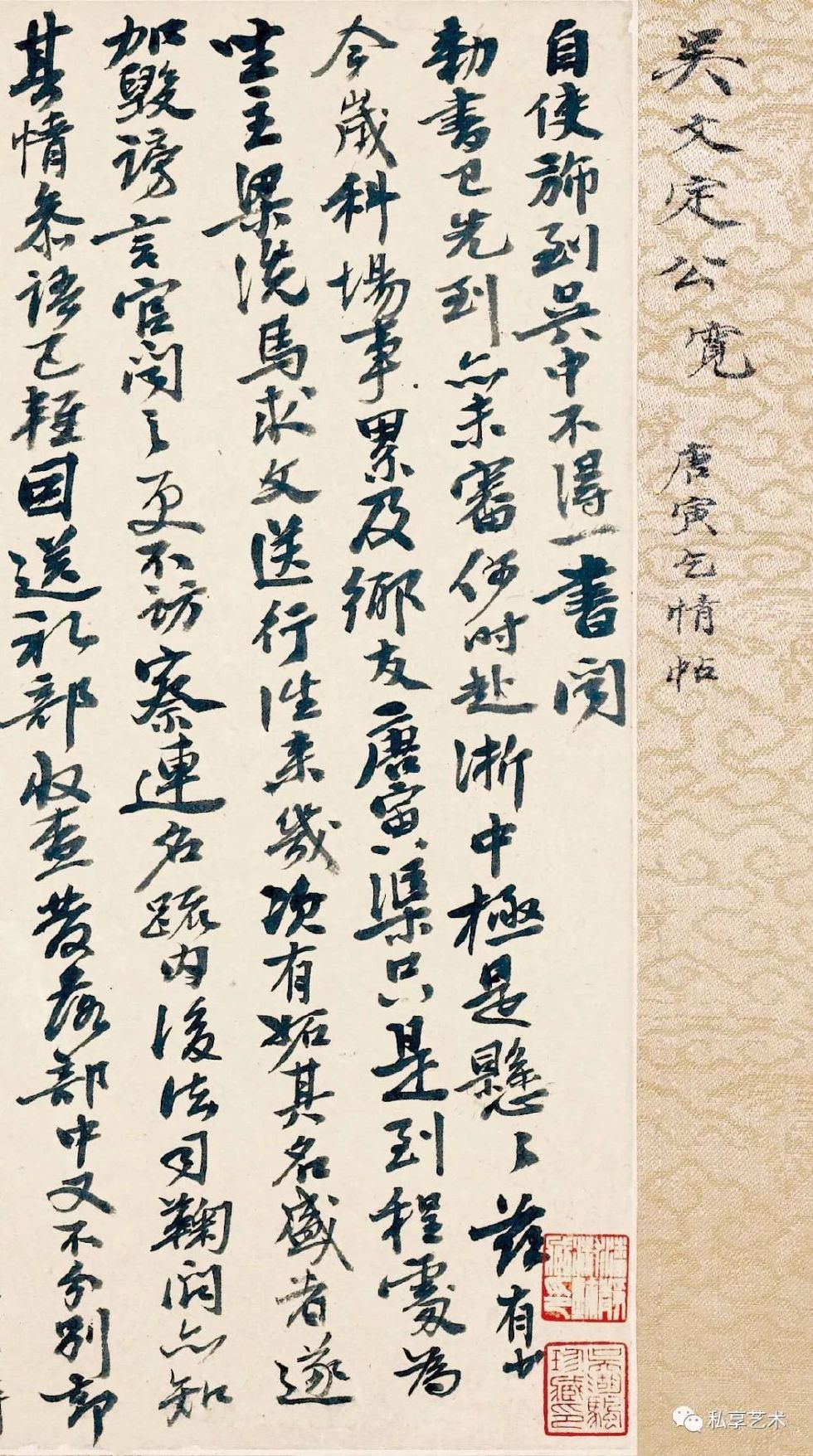 吴宽这通书札,曾经吴湖帆收藏,他将其定名为《唐寅乞情帖》。书札的内容涉及了明代著名的弘治科场弊案。弘治十二年,唐寅挟解元之名参加会试,在考试前与主考官之一程敏政有所往来。试后程敏政被人弹劾收受唐寅及其同伴徐经的贿赂,案件牵连广大,满城风雨,最后查无实据,不了了之。唐寅被拘问后发落到浙江充当吏役。