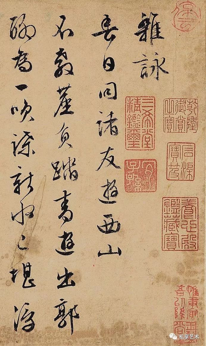 这卷《杂咏诗卷》为文徵明五十七岁致仕后所书,录自作诗十首,计670字。此卷曾于清内府《石渠宝笈初编》着录,贮于养心殿鉴藏。按石渠“凡例”规定,上等书画加钤“乾隆鉴赏”,钤六玺且记载详明。可见乾隆对其展玩摩挲,宝爱有加。