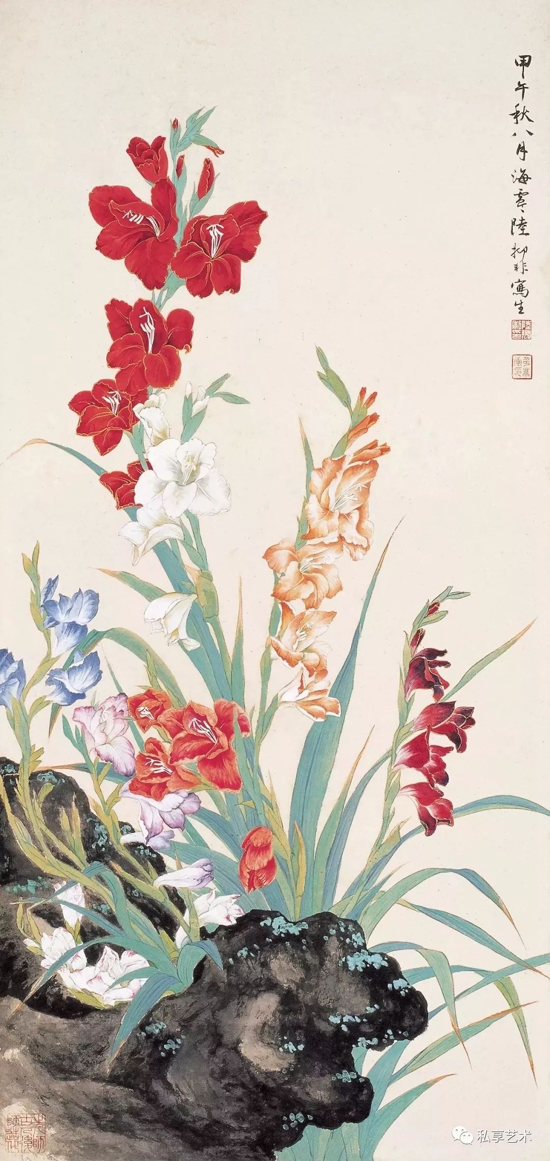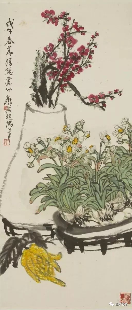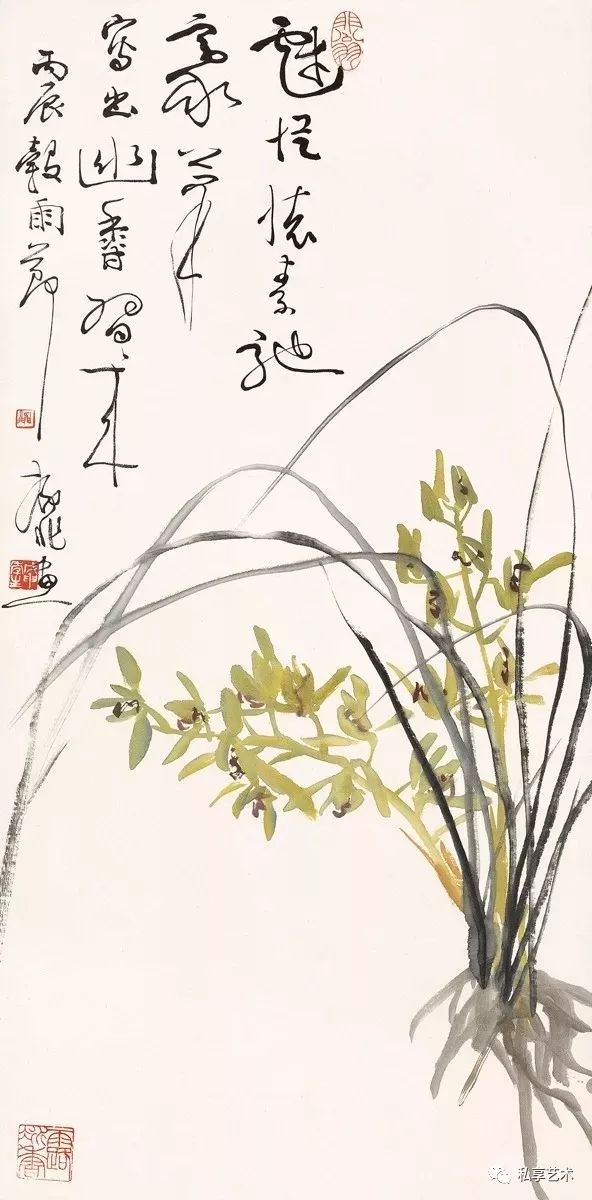 陆抑非早年多工笔重彩,取法吕纪、林良、周之冕、陈洪绶诸家技法,画风清健明丽,讲究韵味。上世纪30年代其花鸟画已享誉沪上画坛,兼工山水。与唐云、张大壮、江寒汀享有“江南花卉四才子”之美誉。中年后又研习和吸取南田、新罗之精髓,精没骨,艳而不俗,工而不滞。晚年汲取青藤、白阳,旁及八大、石涛诸家,并以书入画,舒展灵性,老辣朴茂,而不失典雅之趣。