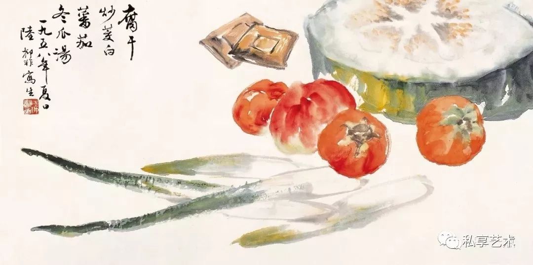 恽南田曾说写生难,蔬果尤难,因此,以前的花鸟画家很少画蔬果。而陆抑非在这方面也下了大功夫,如果空腹看他的作品《腐干炒茭白番茄冬瓜汤》,感觉一桌好菜就要出炉了。