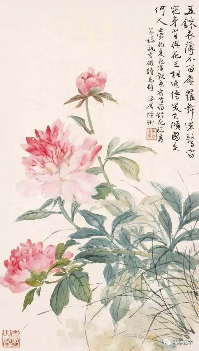 每当春日牡丹花发之际,陆抑非就会去公园、花圃写生,不问风情雨露。在学生马其宽的印象里,陆老总会趁着春光带学生们去花港公园写生。他所作的《赤城霞》,繁简有度;《水墨牡丹》用笔老辣浑厚,从一片艳色中脱颖而出。