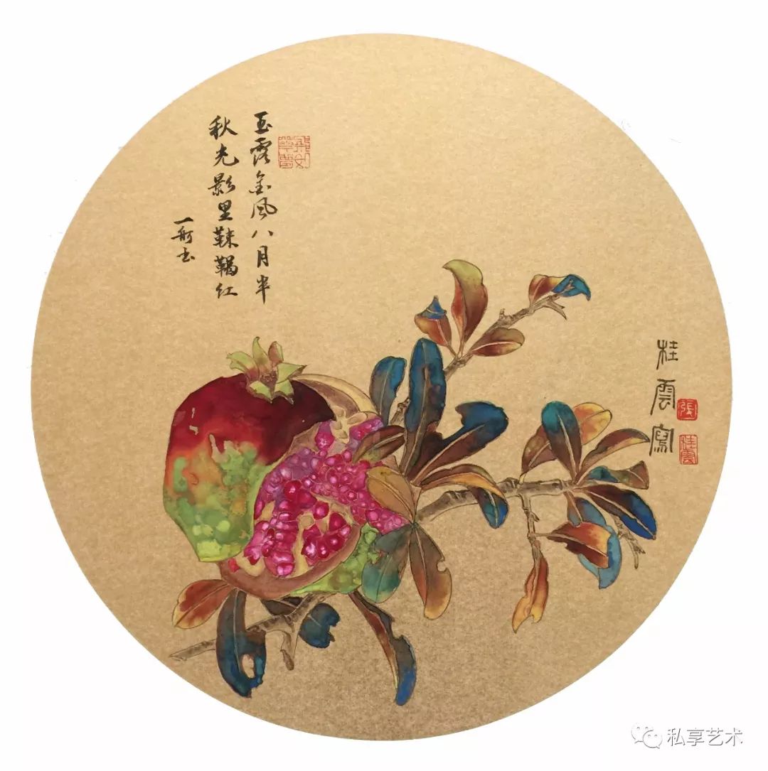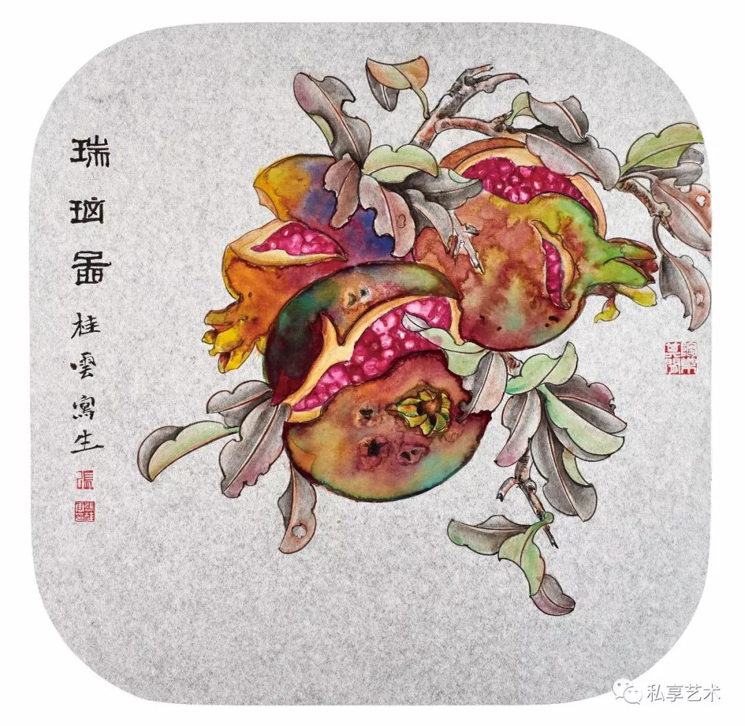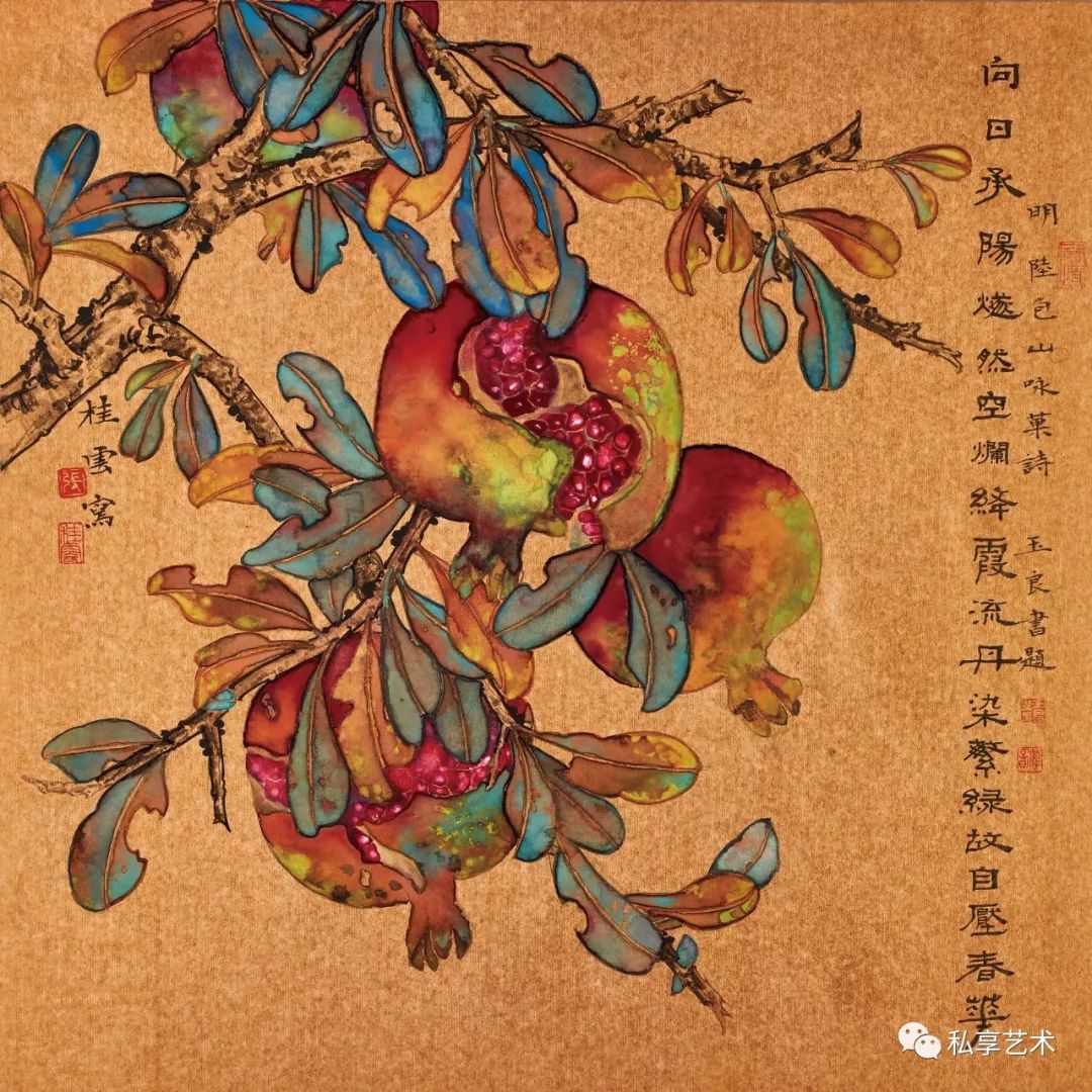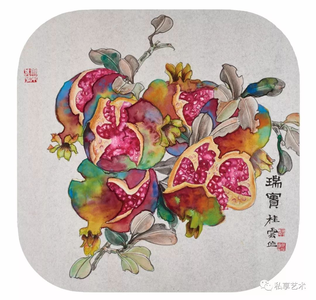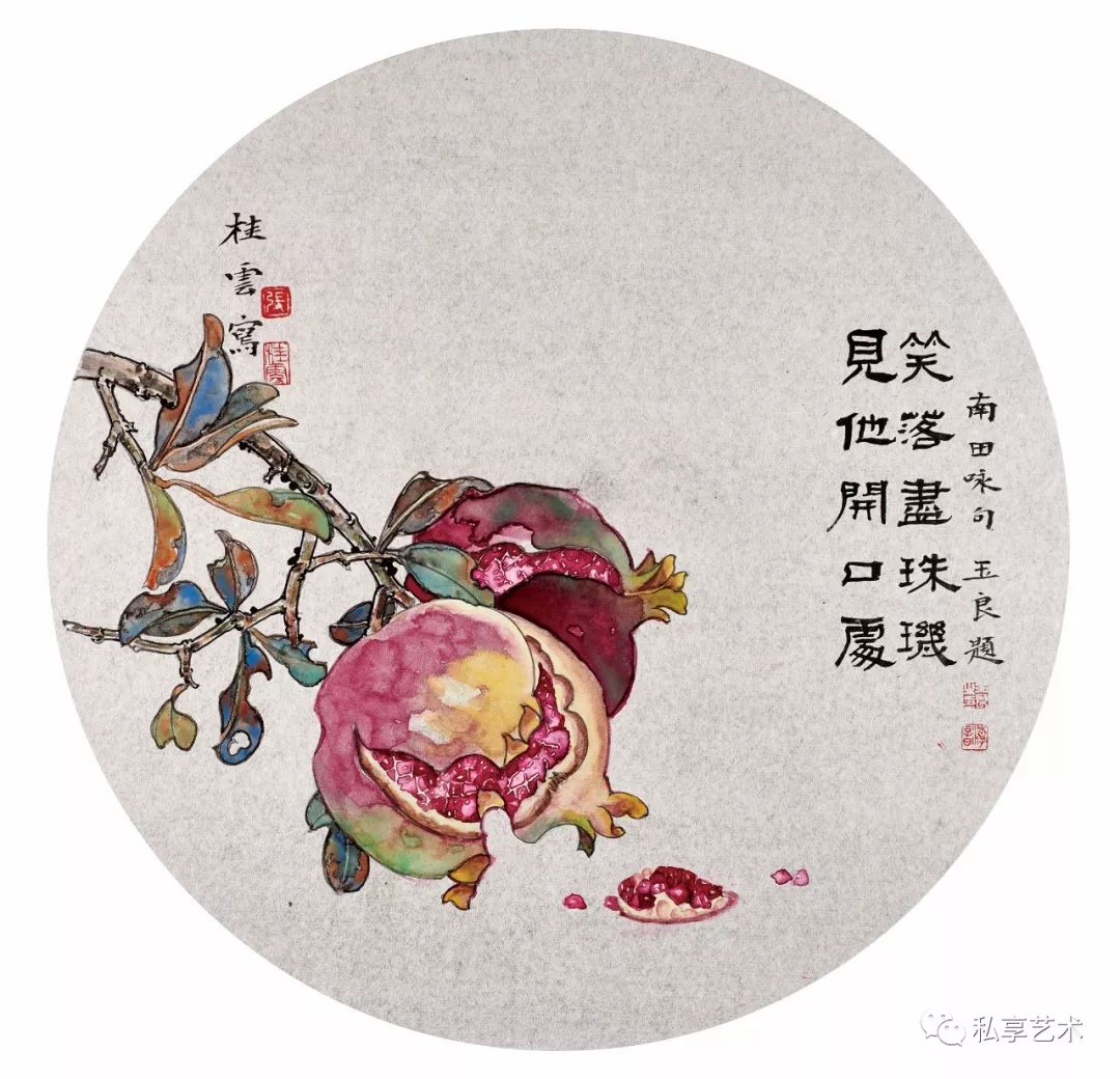 桂云有小院一区,院中有石榴一树。故每朝夕相对,日月静观。更以丹青状其姿态,笔墨发其神情。日月累之,可集一册矣。其所作皆本天然,最有生动之趣。石榴本有嘉寓,画作更表其祥。石榴本有贵气,桂云或以金纸,或以宝色,彰其神貌。余见之皆喜,故为之赞曰:庭生硕果,三秋丰获。累累压枝,郁榴为乐。既祖述于西域,更荣冠以靺鞨。胡歌讴于玉案,旋舞捧于帷幄。状兆吉祥,适明多子之意;时应嘉庆,正合团圆之托。是其花烈如烧焰,盛暑迎阳;果泻似玛瑙,金秋硕著。至乃凉气动于锦囊,金风以为刀错。