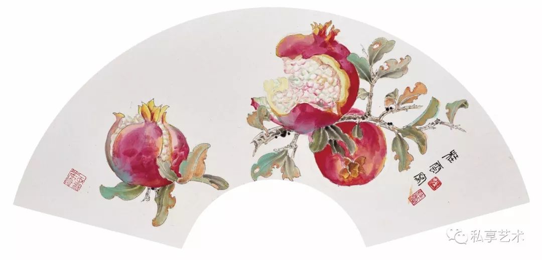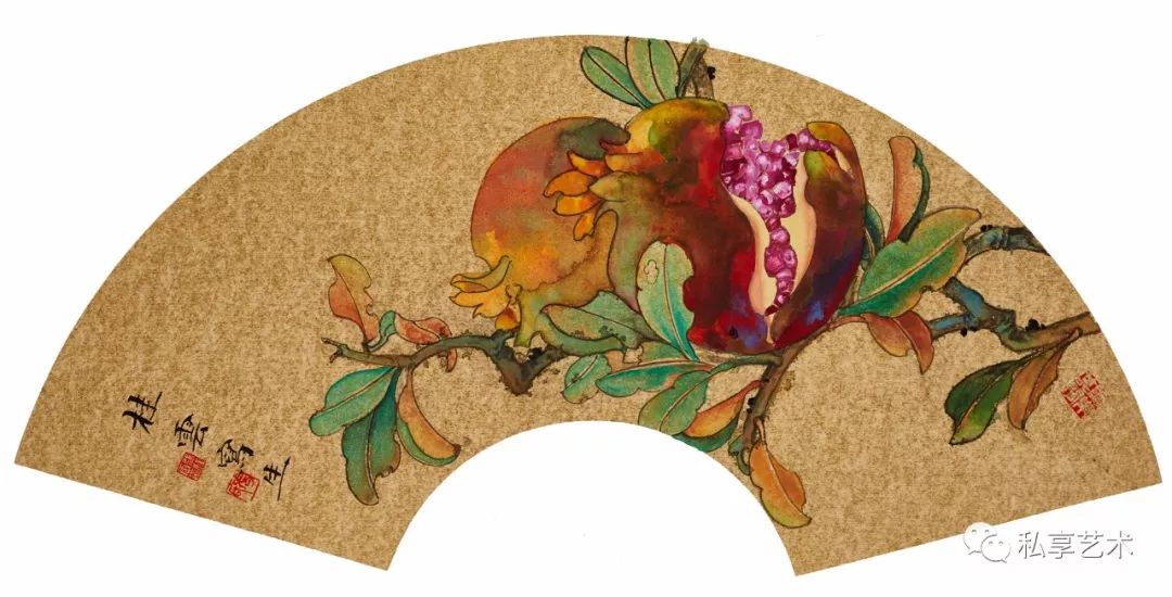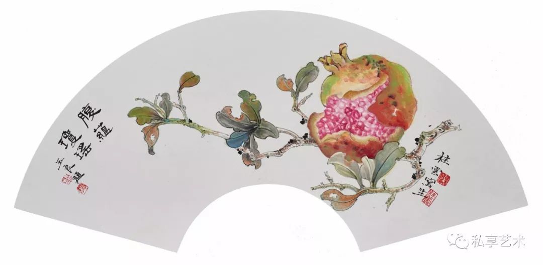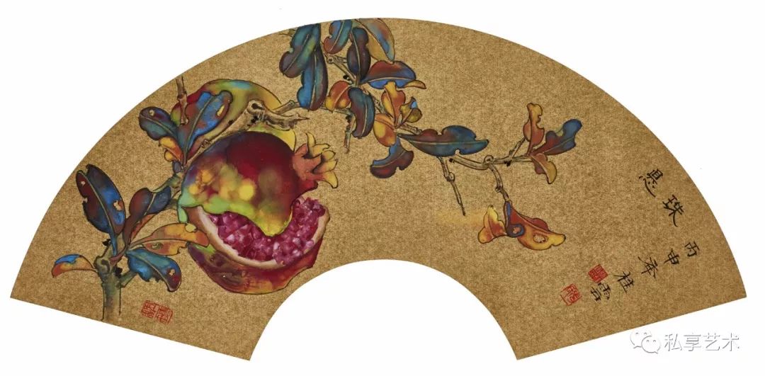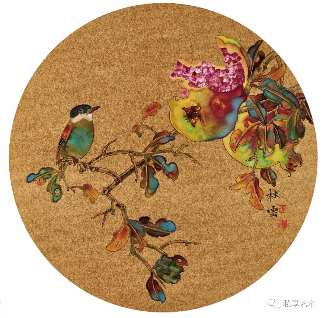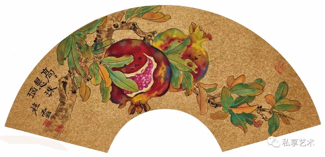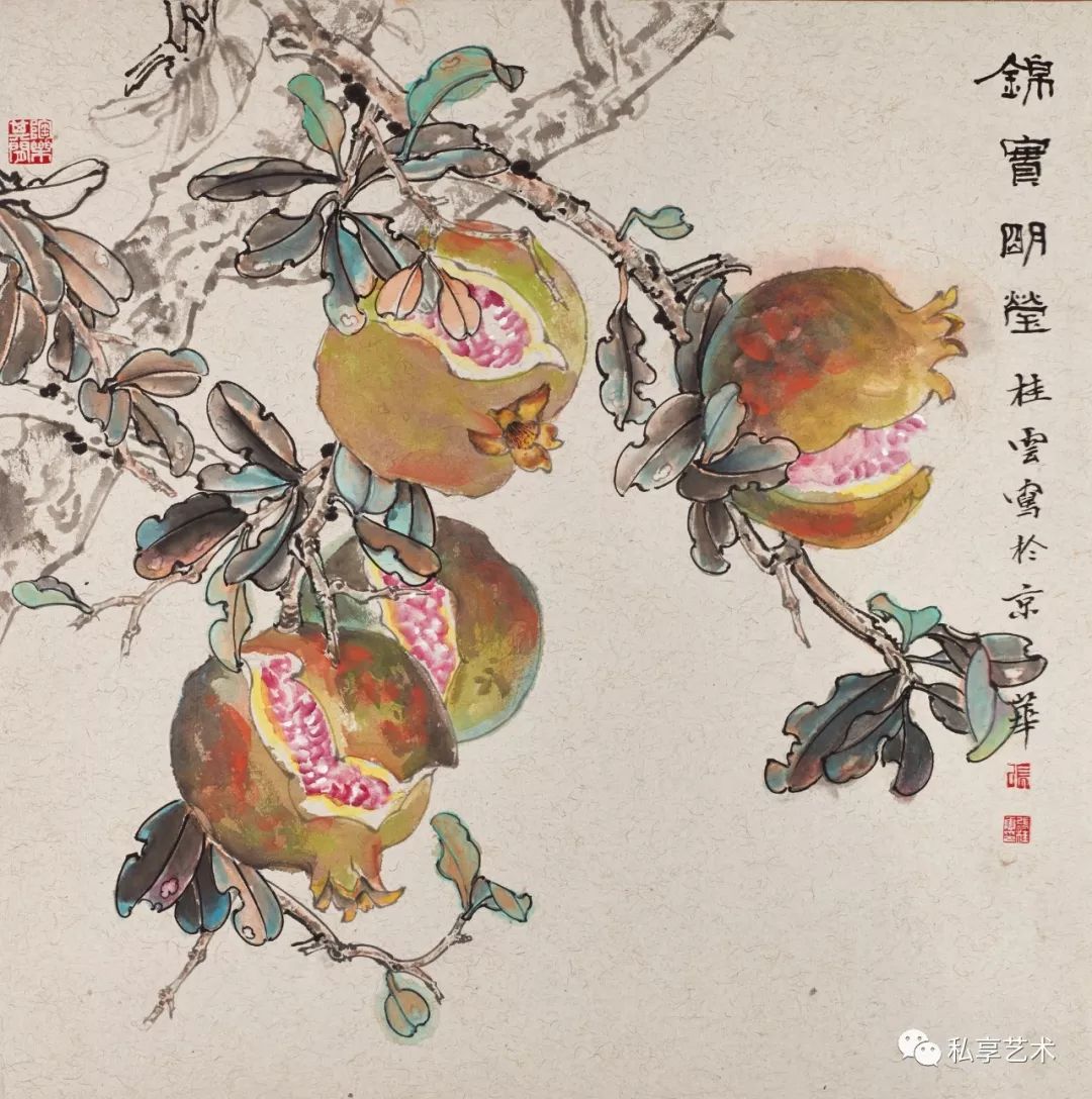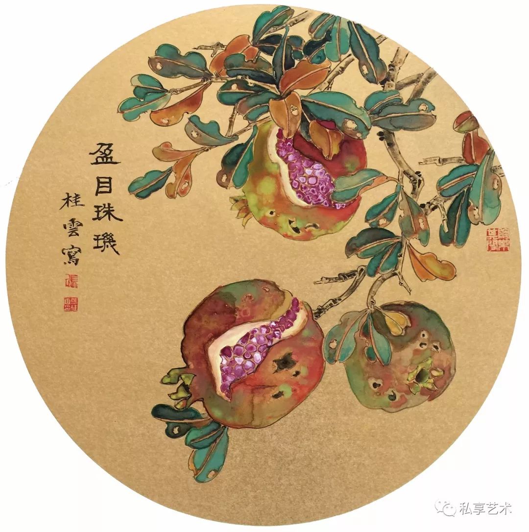 桂云有小院一区,院中有石榴一树。故每朝夕相对,日月静观。更以丹青状其姿态,笔墨发其神情。日月累之,可集一册矣。其所作皆本天然,最有生动之趣。石榴本有嘉寓,画作更表其祥。石榴本有贵气,桂云或以金纸,或以宝色,彰其神貌。余见之皆喜,故为之赞曰:庭生硕果,三秋丰获。累累压枝,郁榴为乐。既祖述于西域,更荣冠以靺鞨。胡歌讴于玉案,旋舞捧于帷幄。状兆吉祥,适明多子之意;时应嘉庆,正合团圆之托。是其花烈如烧焰,盛暑迎阳;果泻似玛瑙,金秋硕著。至乃凉气动于锦囊,金风以为刀错。