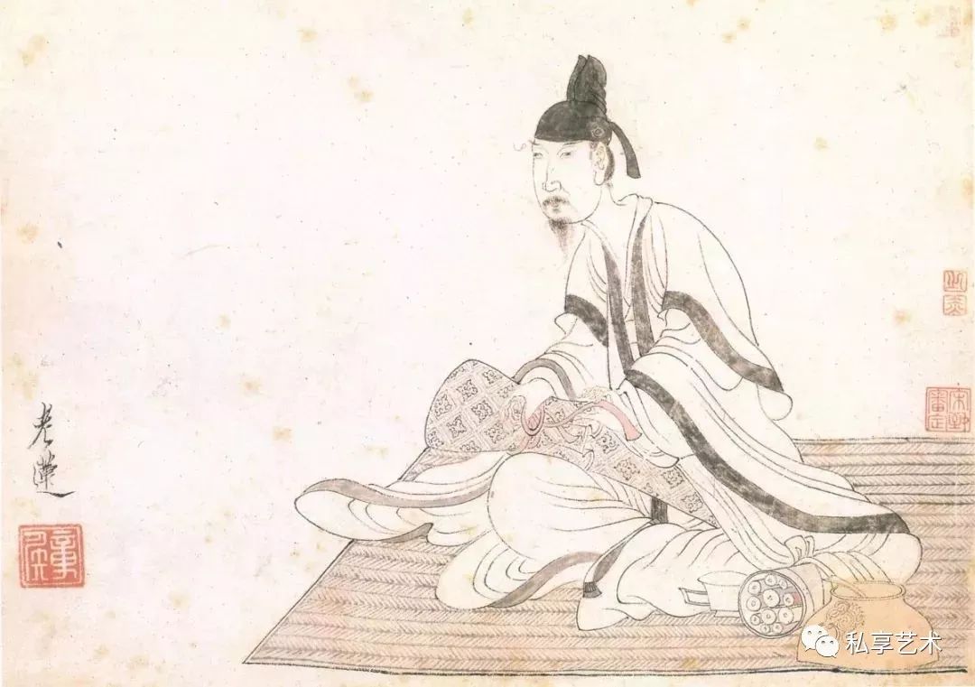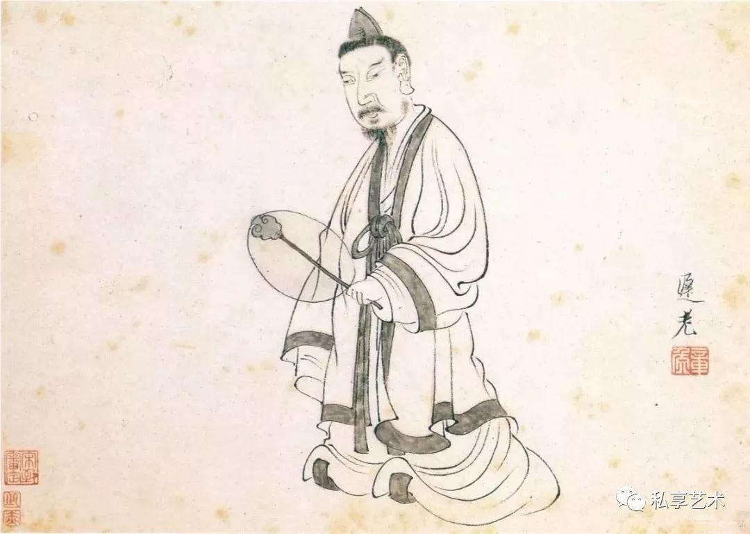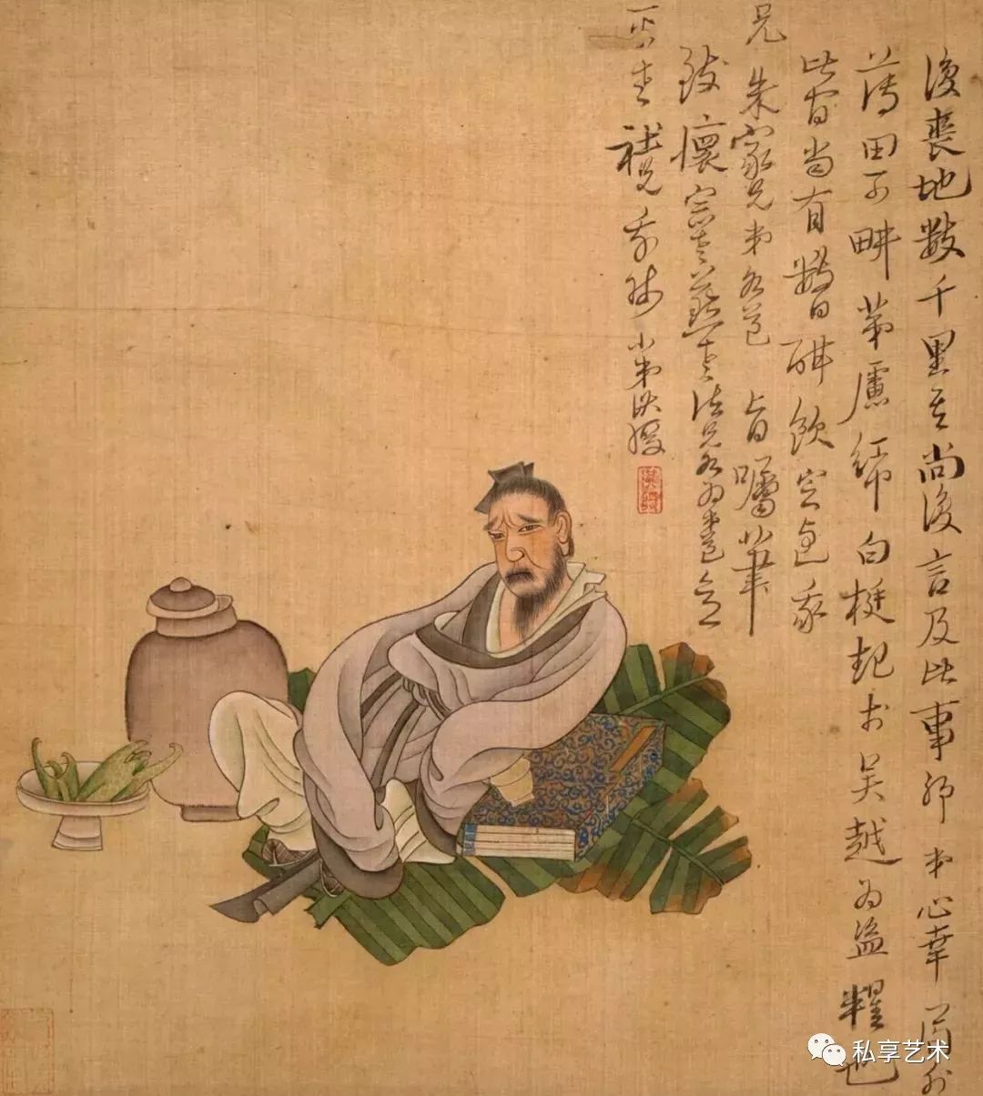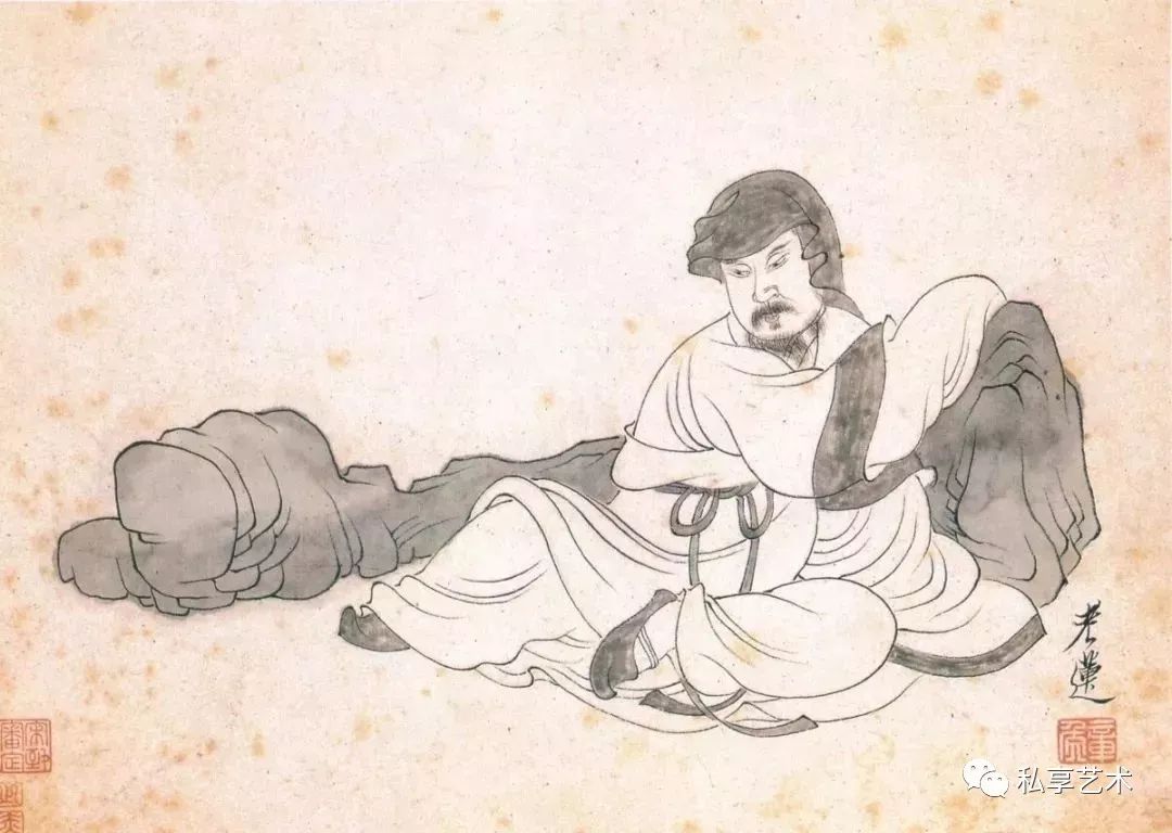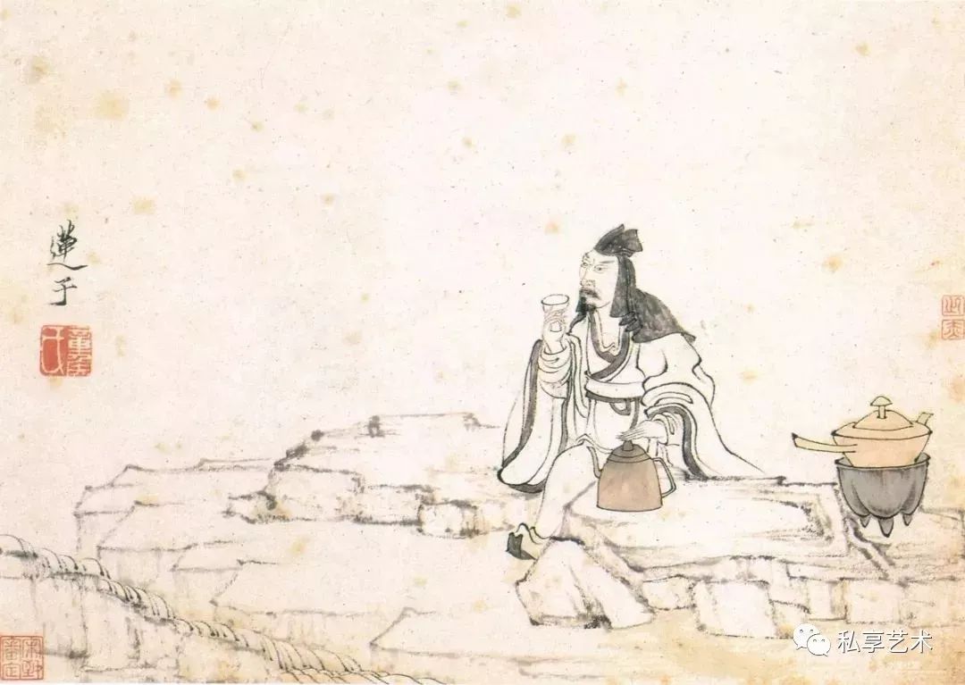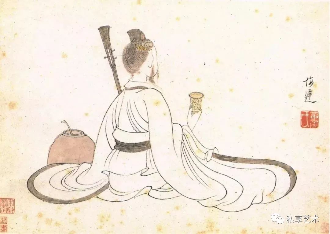 陈老莲则画了一位隐士的背影,他一手持琴,一手持杯,宽广衣袖,云一般舒展在地面,酒坛在其身侧,他微微抬头,游目骋怀,飘逸放达。