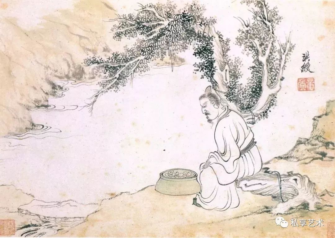 陈老莲的画中,主角可能是战国时期宋国的惠施,在政治失意时去访庄子,结成至友,才有了中国哲学史上的「濠梁之辩」。即惠子曰「子非鱼,安知鱼之乐?」庄子曰:「子非我,安知我不知鱼之乐?」画中那个访庄的人,像是陈老莲自己,他带着一颗出离心,去拜访理想中的精神所在。