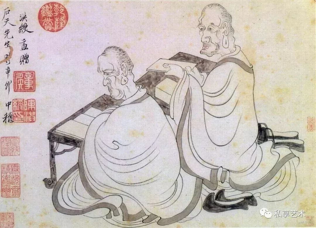 古来诸多文人也是僧人,陈老莲在明末时,避难于绍兴云门寺剃度出家,后还俗,晚年时礼佛参禅,他精神中理想的隐逸世界,有一部分便如画中这样,并非独坐青灯古佛之下,而是有知己共同研读经典。心境恬淡,处处遇禅机,安时处顺,不必真在庙堂之中。
