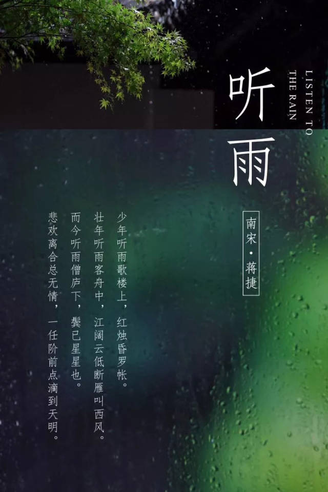 如果说人“三省吾身”是对自我的批判,那么听雨便是对自我的慈悲。最喜欢南宋蒋捷的《虞美人·听雨》一词。少年听雨,人在歌楼;壮年听雨,人在客舟;而今听雨,人在僧庐。他用了人生的三个阶段,写出不同时期人生的境况,而这正是一个人的一生,此时的雨声,成了超越生命之外永恒的载体,我想他书房之外的雨声,一定是“悲欢离合总无情”的超脱境界。