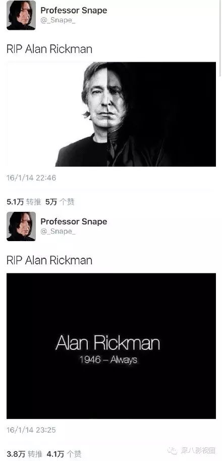 ,连发数条推文悼念真斯内普教授。