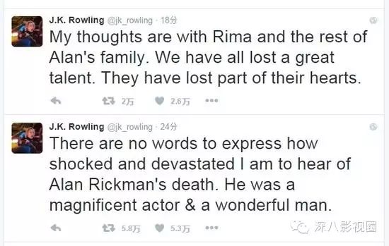 罗琳说:我的哀思与瑞玛和艾伦的家人同在,我们失去了一个伟大的天才,他们失去了心的一部分。