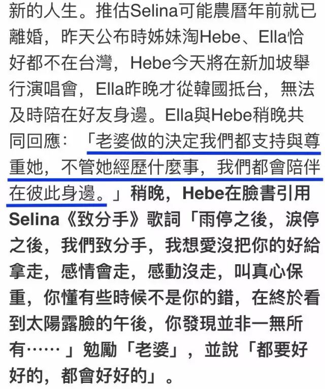 然而并不是每一对夫妻都能有幸白头偕老,今年三月Selina宣布离婚。消息一出,就有媒体指责Selina是“忘恩负义”,两位老婆第一时间声援表示支持她的任何决定