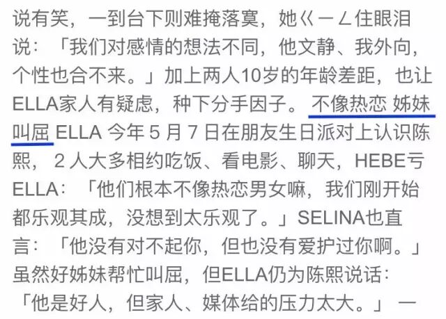 07年,Ella与音乐人陈熙恋爱仅75天后告吹。那段时间她出席活动仍是难掩伤感,但又不忍在媒体面前说前男友的不是。于是身旁的好姐妹忍不住站出来为她叫屈。