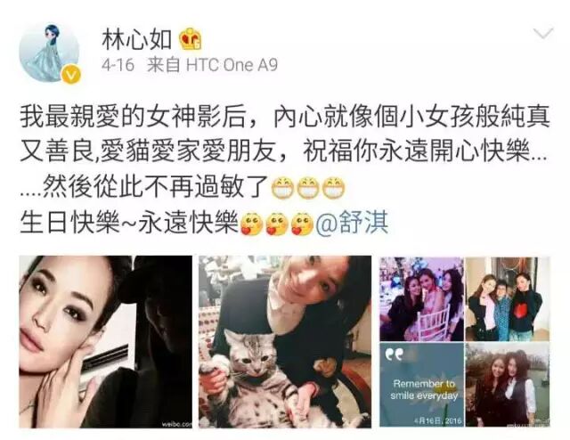 两人都是圈里出了名的友谊大使,人缘炒鸡好~~和刘涛、赵薇等经常微博互动,还曾一起为好友徐若瑄庆生: