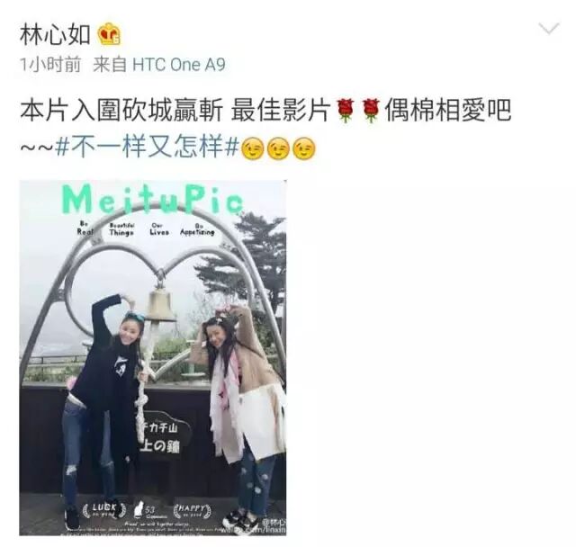 今天林心如发了一条微博,照片上面是她和好闺蜜舒淇组成的一个心形,还配文:“我们相爱吧~~不一样又怎样。”