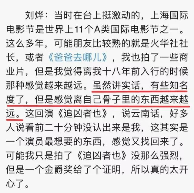 他直言:“十五年前金马奖,十二年前金鸡奖,这中间怎么了,会有着急和不自信,这次得奖是对演员身份的重新认可。”