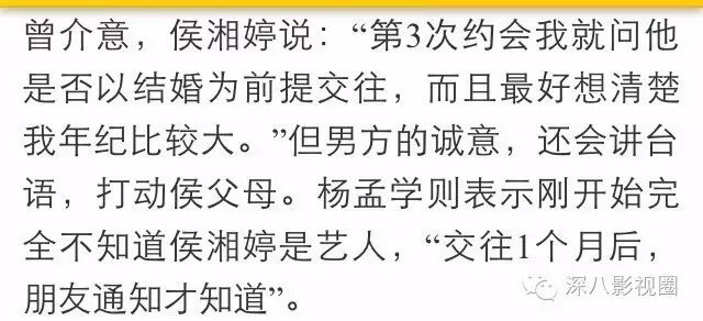 男方开始并不知道侯湘婷曾经是艺人,对她一见钟情,也不介意姐弟恋,两人很快修成正果。