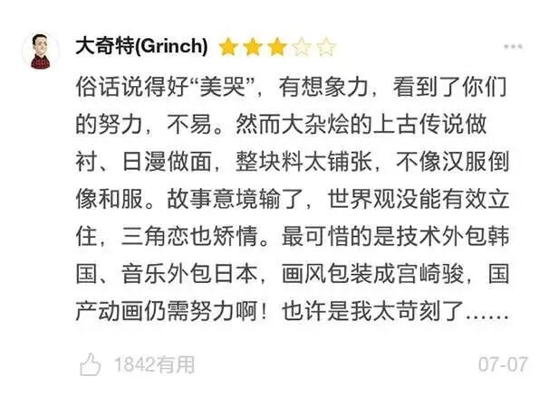 也有人发现这部片子的声画外包给日韩团队参与制作、故事的内核又有印度神话风,却打着“国漫崛起”的情怀牌,上升到民族文化和民族精神来圈钱。