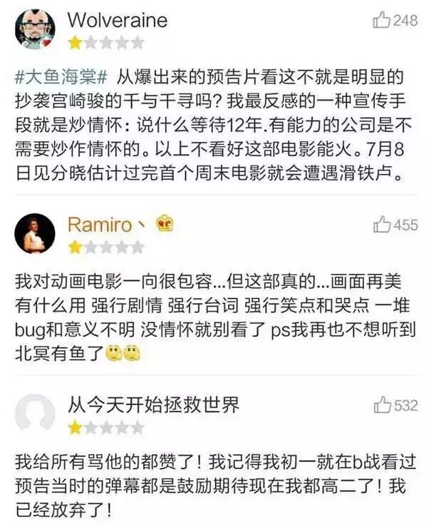 《大鱼海棠》有缺陷,也有值得鼓掌肯定的地方。但是映前大刷情怀牌,高喊12年磨一剑的口号,将大众的期待值抬得太高,失望和吐槽便难免来得凶猛。毕竟观众的观影水平已经日益提升,如果作品质量和期待值不相匹配,尤其没有好的故事,就想让市场买账,那么结果可能会大相径庭。