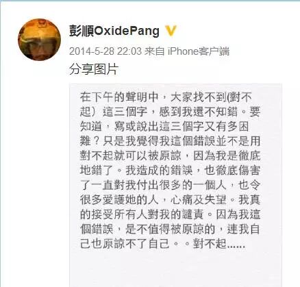 于是28日当晚,彭顺再次发微博声明,称自己“接受所有人的谴责”,承认自己“是不值得原谅的,连我自己都原谅不了自己”