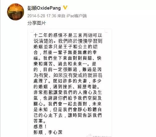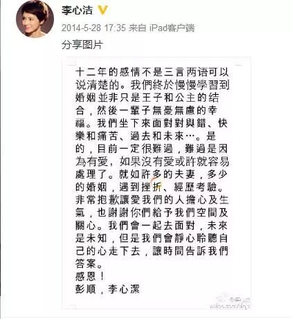 就连这次14年老公婚后出轨,李心洁还是选择了原谅。在5月28日与彭顺联名发微博表示要“一起去面对”