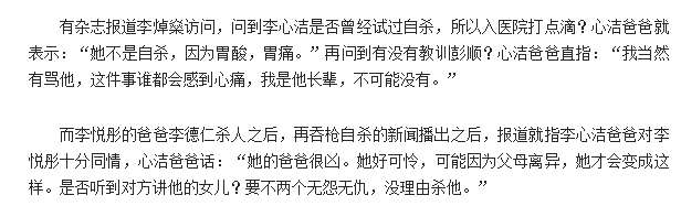 一时间这场时间的三个人,彭顺,李心洁和李悦彤都深陷漩涡。李心洁的父亲在接受采访时称小三李悦彤父亲出了这样的事很可怜,希望大家宽容对她。