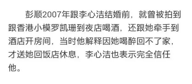 原来,不止14年的这次曝光,早在2007年彭顺就有被爆出和香港小模罗凯珊到夜店喝酒,还到酒店开房,但当时还是女友的李心洁却已表示完全信任彭顺