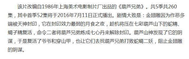 官方对剧情的解释大致就是:大反派金翅雕复活了蛇精和蝎子精,葫芦山神复活了爷爷和穿山甲,双方又开始正邪对立打来打去