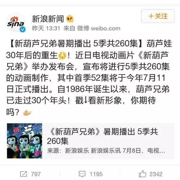 哦弄,今天八八看到又有经典动画片要翻新啦,没错,就是wuli一代不朽的传奇——《葫芦娃》~~~