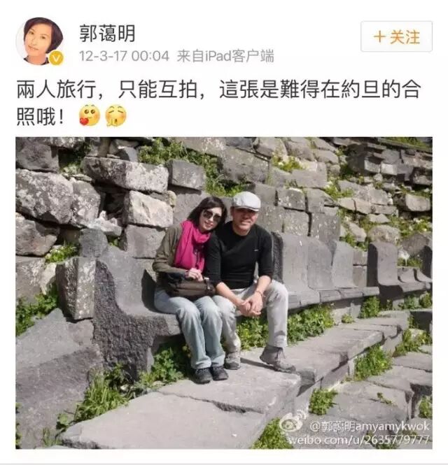 郭蔼明则很少发微博,唯一的秀恩爱是因为在旅行中收获了一张难得得合照。下次建议带个自拍杆哈~