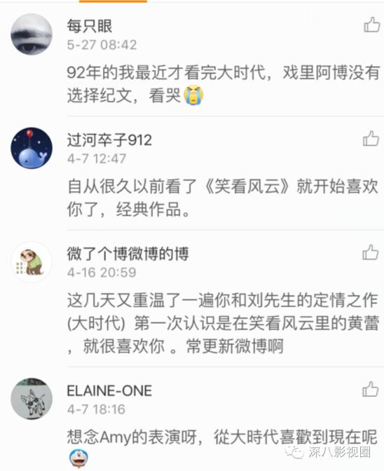 郭蔼明2012年开通微博后,除了例行的节日祝福之外,每年平均的更博次数不到两位数。人气也和现在的小花们没法比,每条评论不过几十上百,但每隔一段时间,总有粉丝跑去留言,说好想念你的《大时代》和《笑看风云》
