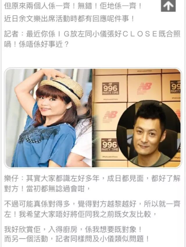 文章里的描述不但是绘声绘色,居然有双方当事人承认恋情的说法,看起来真的不能再真。记者问他们在IG上晒出了亲密合影,是恋爱了吗?余文乐表示对方出得厅堂入得厨房,是他的理想对象。