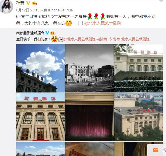 人艺64周年的时候,孙茜微博说:"如果有一天找不到我,十有八九是在人艺。"对老东家感情颇深呐,