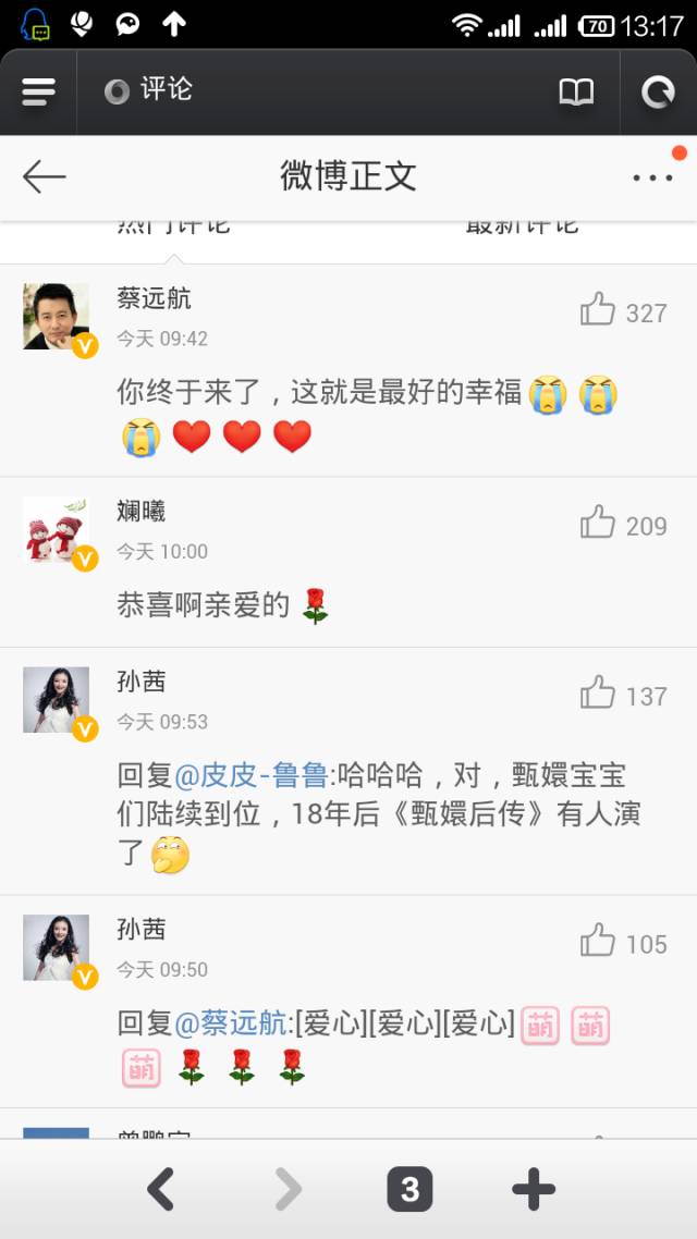 网友纷纷送上祝福,甄嬛的编剧和演员也送上祝福。热门评论第一的是老公蔡远航,说这是最好的幸福。