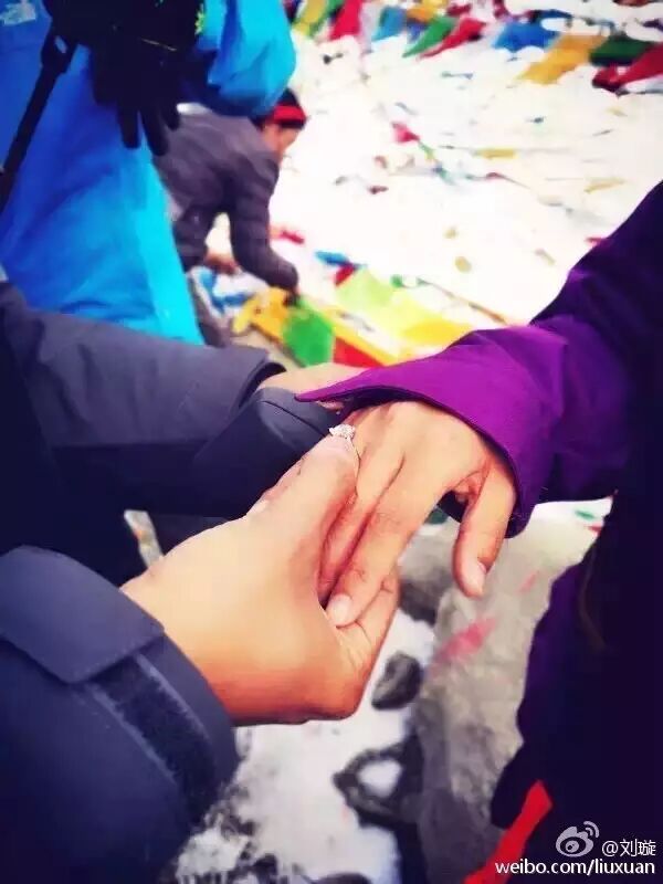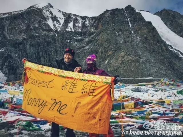 没错,他们不仅谈了,而且昨天还求婚了呢,陈亦飞准备了一块藏族style的旗帜,上面写着 "DEAREST 维维 Marry