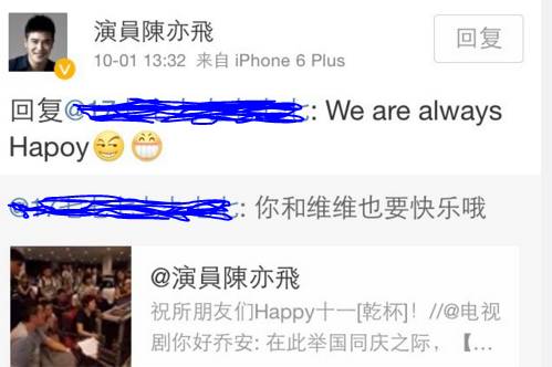 谭维维与陈亦飞2014年被拍到约会后公布恋情,有网友说,你们要快乐哦,他直接回复 we are always
