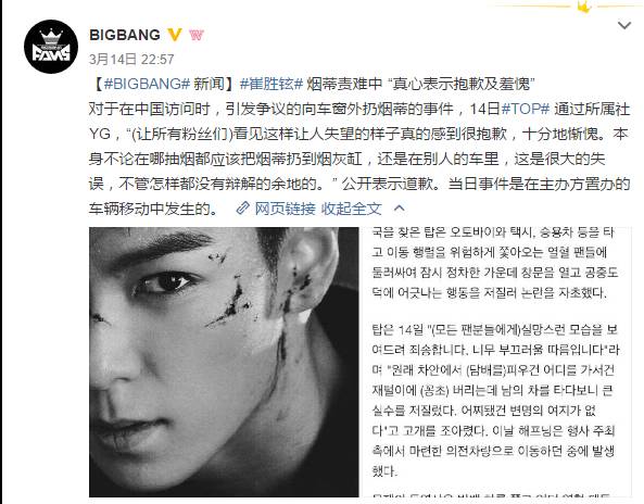 结束活动后,Bigbang成员乘车离开。狂热的粉丝追车,一直在大喊“欧巴撒浪嘿”。TOP当时可能有点微醺,一个兴奋就打开车窗,往外面扔了个烟头,然后跟粉丝比爱心。