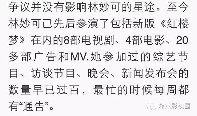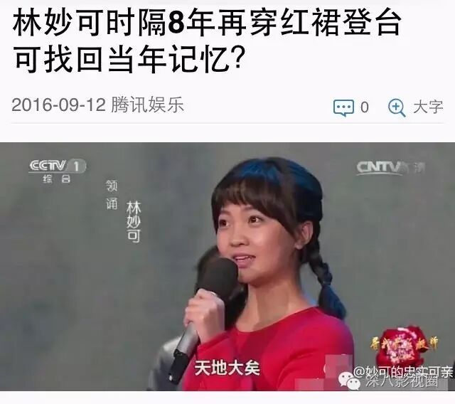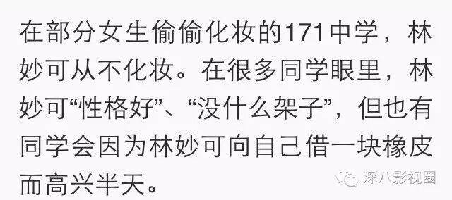 虽然深八君对细节有些想不通的地方,但是林妙可在校园集体中的表现,从成名初始到现在高中时期,确实有很大的变化。初中时期《南方周末》采访她的同学,得到的回答是“林妙可没架子,好相处”。