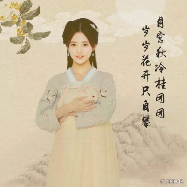 中秋节就要到噜,SNH48第三届总选举的前七名美少女应景地拍摄了一组嫦娥写真,融合了多种中秋元素,鞠婧祎抱玉兔,