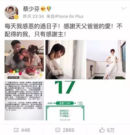 然而有的明星却因没有为此发声,而被各种攻击。比如蔡少芬,在微博发了感恩庆生的照片和文字。