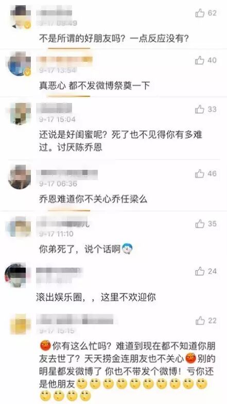 无数网友到陈乔恩微博下攻击她:“好朋友去世了也不出来说句话吗?”原本只有1万的评论被各种言论堆积到30万。