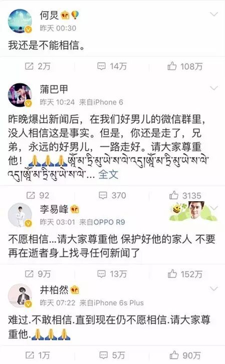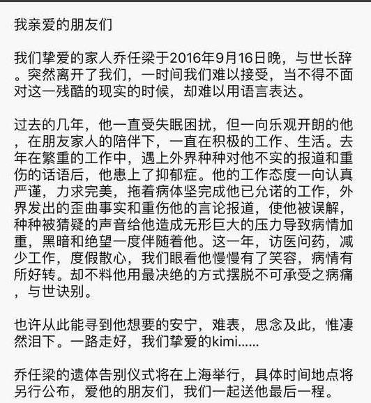 乔任梁因抑郁症突然离世的消息震惊了娱乐圈,圈内众多明星及好友纷纷发微博悼念。