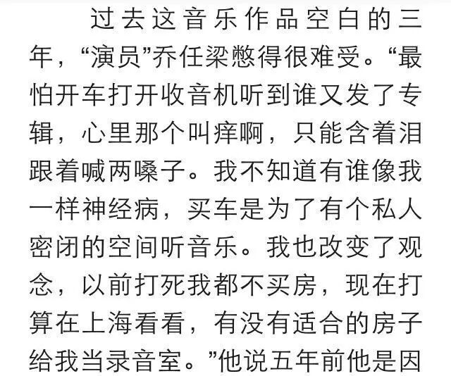 而乔任梁也说最需要有自己的私密空间。买车是为了有私密空间听音乐,买房是为了当录音师。