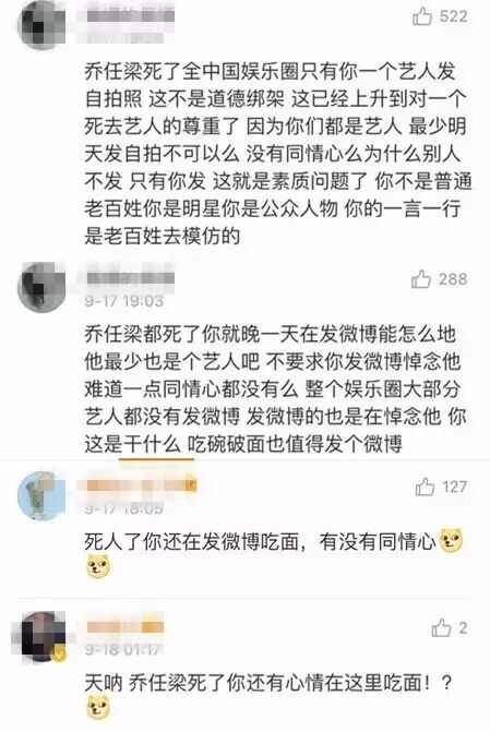 结果被网友们喷没有同情心,又吃面,又发自拍。网友们说这是对过世艺人的不尊重。