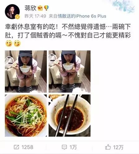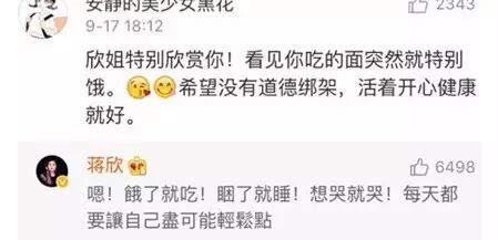 蒋欣的微博也是重灾区。昨天下午蒋欣微博发了自己吃面的图,