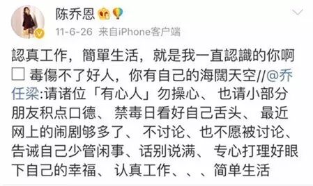 陈乔恩也会在乔任梁被网络舆论攻击时站出来为他说话,鼓励他“认真工作,简单生活”。